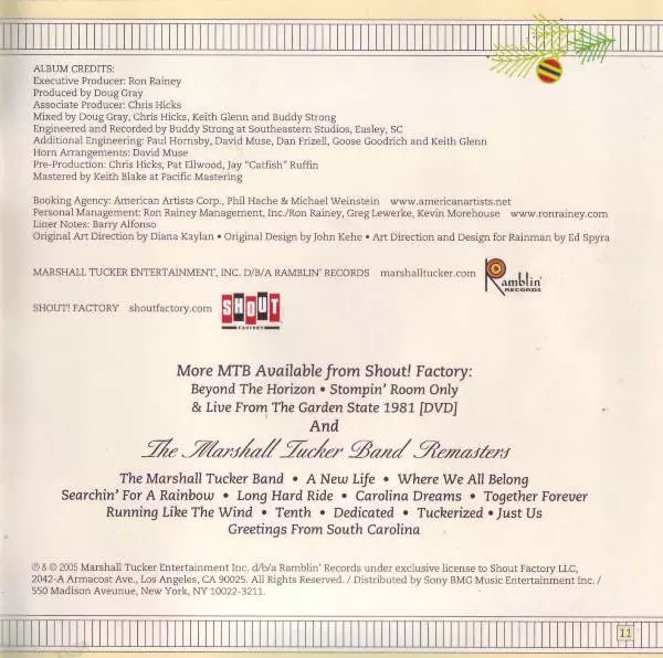 The Marshall Tucker Band: Carolina Christmas versión en CD en estándar edición. Esta edición en concreto se lanzó en EE.UU. en la editorial Shout! Factory en colaboración con Ramblin' Records (3) el día 20. noviembre 2015. Álbum abarca todos los géneros Rock, Blues-Rock, Southern Rock, Country-Rock y Christmas.