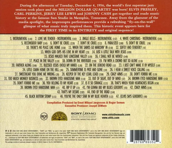The Million Dollar Quartet: The Complete Million Dollar Quartet versión en CD en remasterizado edición. Esta edición en concreto se lanzó en Europa y Reino Unido en la editorial RCA en colaboración con Sun Record Company y Sony BMG Music Entertainment Strategic Marketing Group el día 22. septiembre 2006. Álbum abarca todos los géneros Rock, Folk, World, & Country, Country, Rock & Roll, Bluegrass y Gospel.