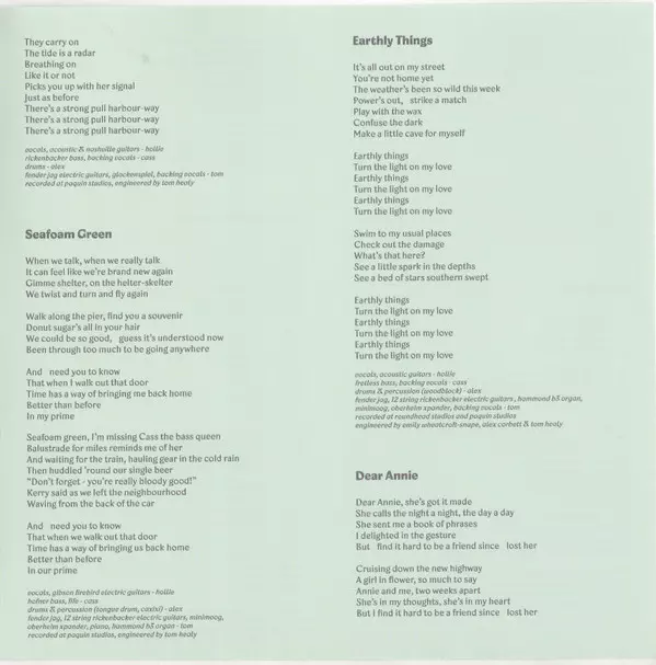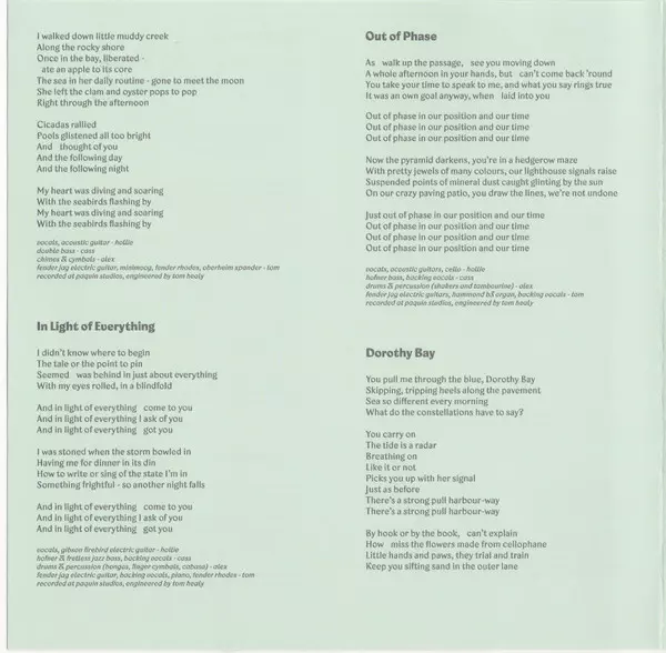 Drums Alex Freer | Electric Bass [Rickenbacker], Backing Vocals Cass Basil | Electric Guitar [Fender Jaguar], Glockenspiel, Backing Vocals Thomas Healy | Vocals, Acoustic Guitar, Acoustic Guitar [Nashville Guitar] Hollie Fullbrook