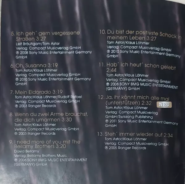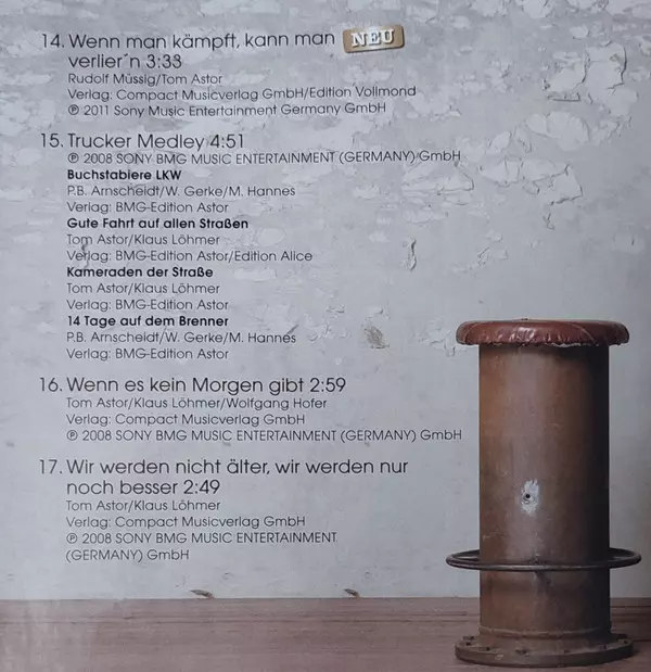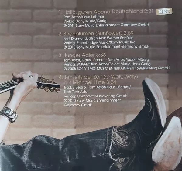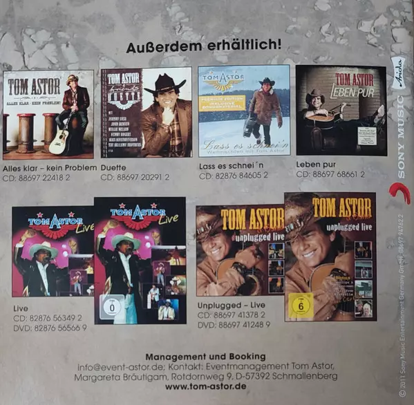 Tom Astor: Seine Grössten Hits versión en CD en estándar edición. Esta edición en concreto se lanzó en Europa en la editorial Sony Music en colaboración con Ariola el día 9. agosto 2011. Álbum abarca todos los géneros Pop, Folk, World, & Country y Schlager.