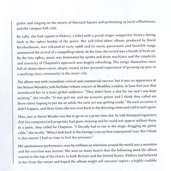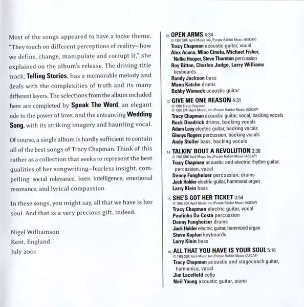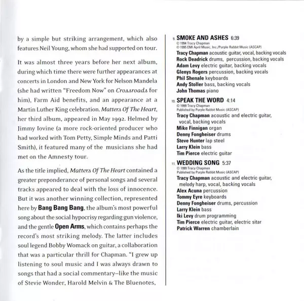 Acoustic Guitar Bobby Womack | Acoustic Guitar, Vocals Tracy Chapman | Bass Randy Jackson (2) | Drums Manu Katché | Keyboards Charles Judge, Larry Williams, Roy Bittan | Percussion Alex Acuña, Michael Fisher, Mino Cinelu, Nellee Hooper, Steve Thornton