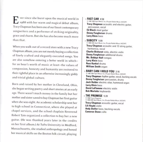 Bass Larry Klein | Drums Denny Fongheiser | Electric Guitar, Organ [Hammond] Jack Holder | Electric Guitar, Vocals Tracy Chapman | Keyboards Steve Kaplan | Percussion Paulinho Da Costa