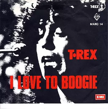 T. Rex: I Love To Boogie versión en vinilo SP en 45 RPM edición. Esta edición en concreto se lanzó en Dinamarca en la editorial T. Rex del año 1976. Álbum abarca todos los géneros Rock y Glam.
