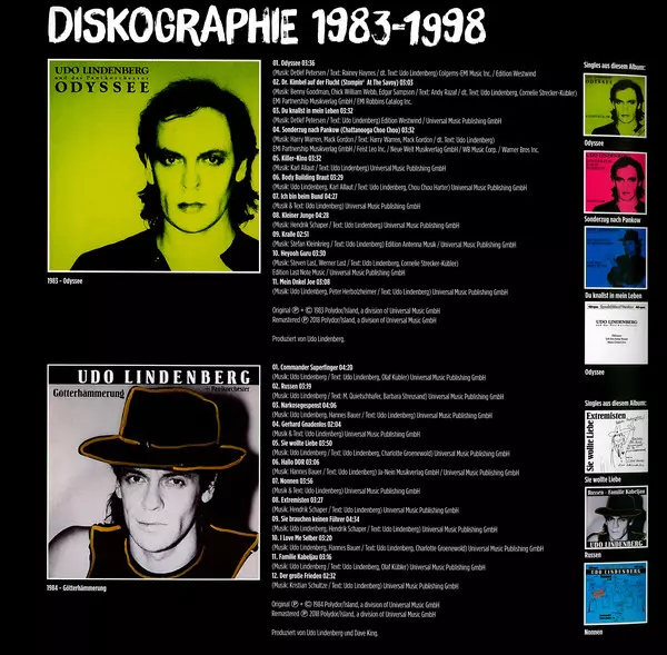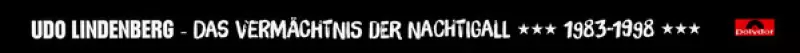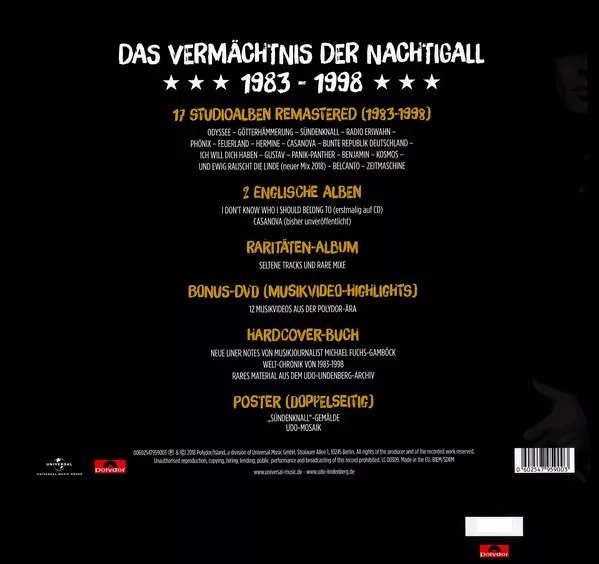 Udo Lindenberg: Das Vermächtnis Der Nachtigall 1983-1998 DLX | LTD | NUM versión en 20CD/DVD/Caja en remasterizado deluxe de edición limitada numerados individualmente edición. Esta edición en concreto se lanzó en Alemania en la editorial Polydor en colaboración con Universal Music Group el día 7. diciembre 2018. Álbum abarca todos los géneros Rock y Pop. Numbered Deluxe Limited Edition.