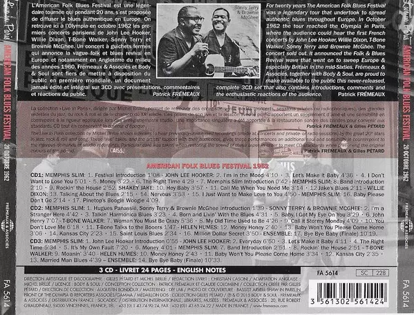 Various: American Folk Blues Festival 1962 versión en 3CD en estándar edición. Esta edición en concreto se lanzó en Francia en la editorial Frémeaux & Associés el día 1. septiembre 2015. Álbum abarca todos los géneros Rock, Pop, Escenario y pantalla, Blues, Pop Rock y Soundtrack.