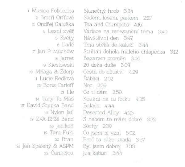 | Accordion Tomáš Görtler | Contrabass Petr Tichý | Engineer [Zvuk] Robert Plicka | Guitar, Ukulele Vojtěch Jindra | Lyrics By [Text] Jiří Suchý | Mixed By Boris Carloff | Music By Vladimír Mišík | Saxophone [Saxofony] Helena Marková | Vocals, Recorder [Flétny] Robert Fischmann | |||