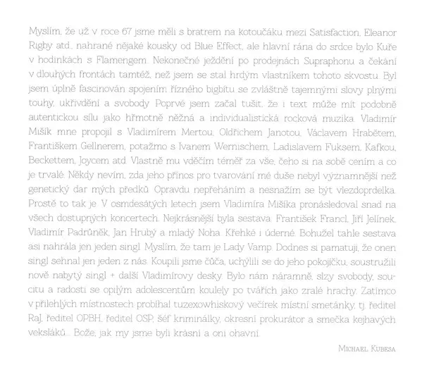 This album is a tribute to the late Czech singer-songwriter Vladimir Misik. It contains cover versions of his songs by various artists, including Mišík's son Vladimír Mišík Jr. The album is a blend of rock, folk and blues styles and shows a wide range of Mišík's musical influences.