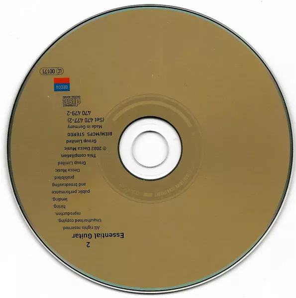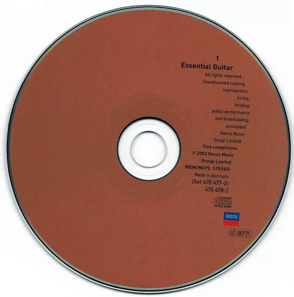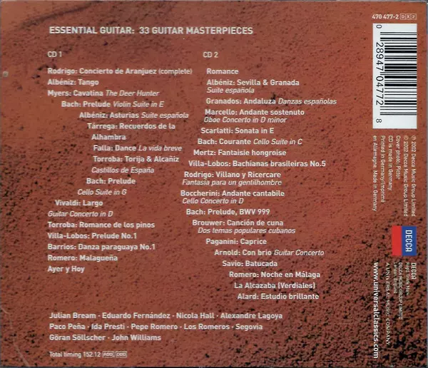 Various: Essential Guitar (33 Guitar Masterpieces) versión en 2CD en estándar edición. Esta edición en concreto se lanzó en Alemania en la editorial Decca el día 13. agosto 2002. Álbum abarca todos los géneros Música clásica, Folk, World, & Country, Música barroca, Modernism, Romance y Flamenco.