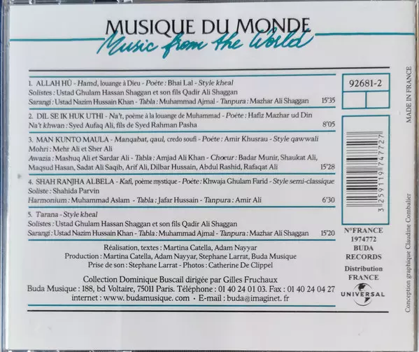 Backing Vocals [Chorus] Abdul Rashid (3), Arif Ali, Badar Munir, Dilbar Hussain, Maqsood Hussain, Rafaqat Ali Khan, Sadat Ali Saqib, Shaukat Ali | Lead Vocals Mehr Ali (2) | Tabla Amjad Khan (2) | Vocals Sardar Ali | Vocals, Harmonium Mashuq Ali, Sher Ali | Words By [Poet] Amir Khusrow | |||