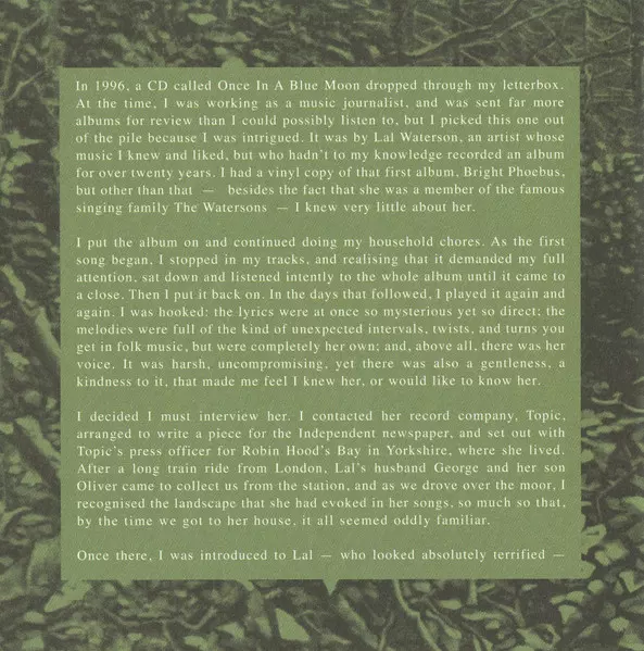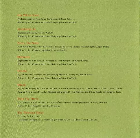 | Performer, Arranged By, Engineer, Producer Malcolm Lindsay, Robert Fisher (2) | Written-By Lal Waterson, Oliver Knight | |||