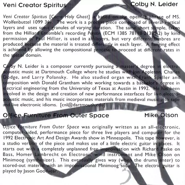 | Electronics [Kyma Digital Signal Processing System] Lawrence Fritts | Voice Chris Mann | |||