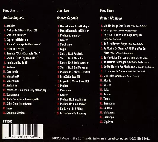 A great 3CD compilation featuring highlights of classic Spanish guitar art. Spanish Guitar Music" includes a number of pieces by Andres Segovia and Ramon Montoya.