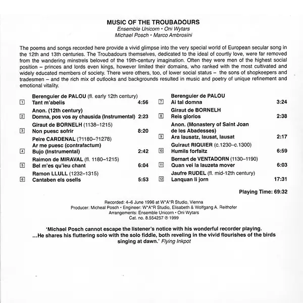 3-11 | Marco Ambrosini, Oni Wytars, Ensemble Unicorn, Michael Posch: Quan Vei La Lauzeta Mover | 6:03 min | |