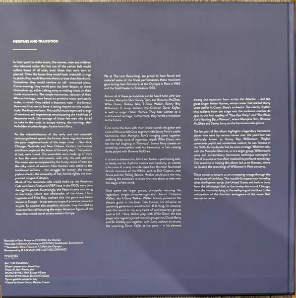 Various: The Original American Folk Blues Festival (Live In Paris 1962 • Bremen 1963) NUM | LTD versión en vinilo 2LP en numerados individualmente remasterizado de edición limitada edición. Esta edición en concreto se lanzó en Francia en la editorial The Lost Recordings el día 31. enero 2025. Álbum abarca todos los géneros Blues, Chicago Blues y Delta-Blues.
