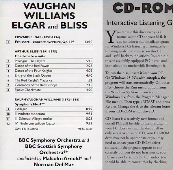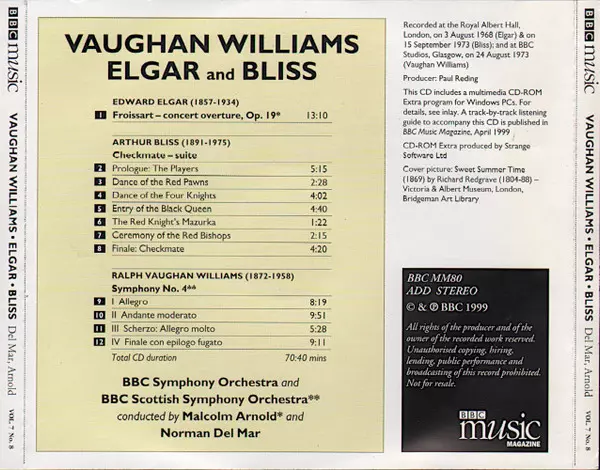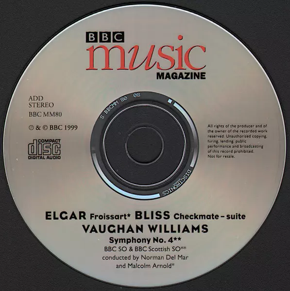 | Artista | Sir Edward Elgar | BBC Symphony Orchestra | Ralph Vaughan Williams | Malcolm Arnold | BBC Scottish Symphony Orchestra | Arthur Bliss | Norman Del Mar |
