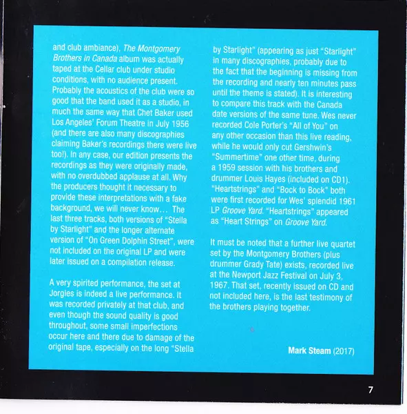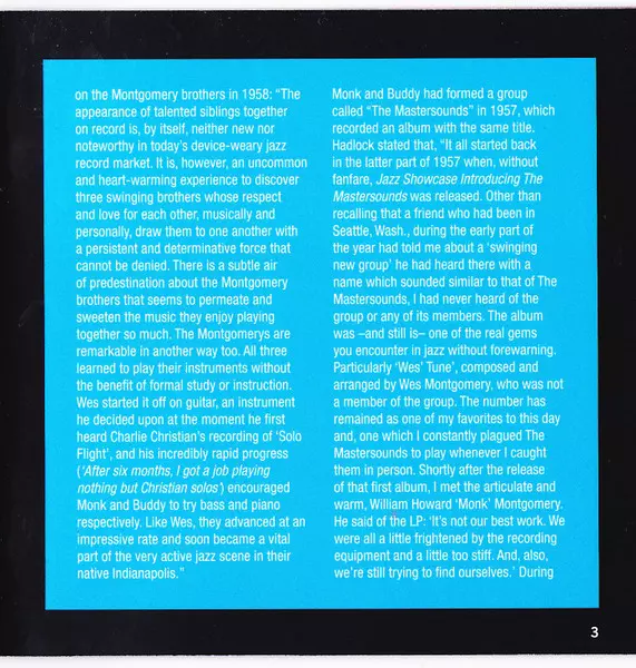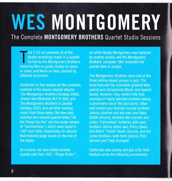 Wes Montgomery: The Complete Montgomery Brothers Quartet Studio Sessions versión en 3CD en remasterizado edición. Esta edición en concreto se lanzó en Europa en la editorial Essential Jazz Classics el día 27. octubre 2017. Álbum puede clasificarse como género Jazz. 24 Bit.