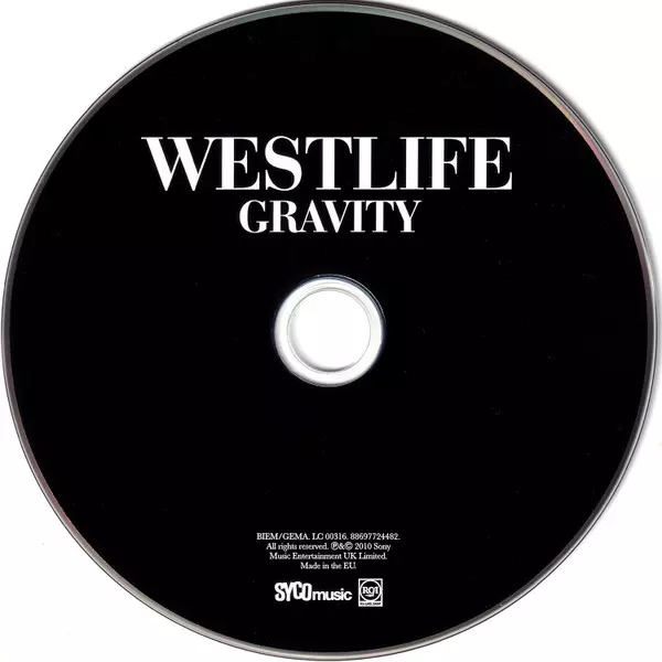 Westlife: Gravity versión en CD en estándar edición. Esta edición en concreto se lanzó en Europa en la editorial Syco Music en colaboración con RCA Label Group y Sony Music el día 1. junio 2015. Álbum abarca todos los géneros Rock, Pop, Balad y Pop Rock.