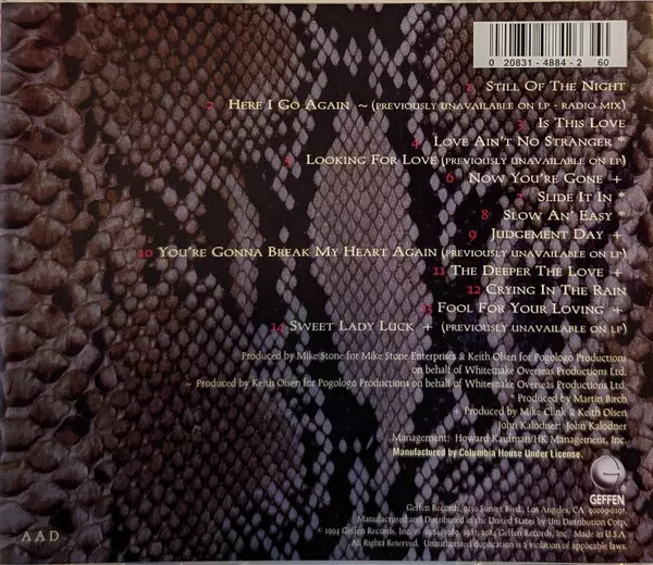 Whitesnake: Greatest Hits versión en CD en estándar edición. Esta edición en concreto se lanzó en EE.UU. en la editorial Geffen Records.
