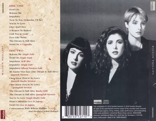 Wilson Phillips: Wilson Phillips versión en 2CD en estándar edición. Esta edición en concreto se lanzó en Europa en la editorial Caroline International el día 16. diciembre 2016. Álbum abarca todos los géneros Rock, Pop, Pop Rock y Soft Rock.