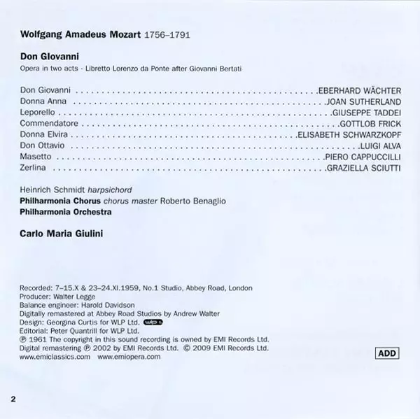 | Artista | Wolfgang Amadeus Mozart | Philharmonia Orchestra | Carlo Maria Giulini | Philharmonia Chorus | Joan Sutherland | Elisabeth Schwarzkopf | Piero Cappuccilli | Gottlob Frick | Eberhard Wächter | Luigi Alva | Giuseppe Taddei | Graziella Sciutti |