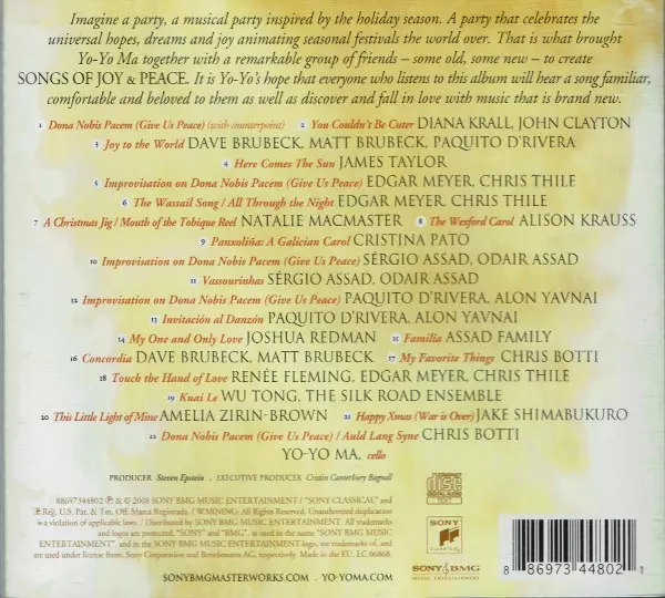 Yo-Yo Ma: Songs Of Joy & Peace versión en CD en estándar edición. Esta edición en concreto se lanzó en Europa en la editorial Sony Classical el día 17. octubre 2008. Álbum abarca todos los géneros Pop, Música clásica, Folk, World, & Country, Jazz, Contemporary Jazz y Religious.