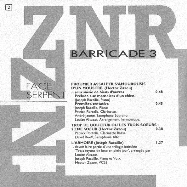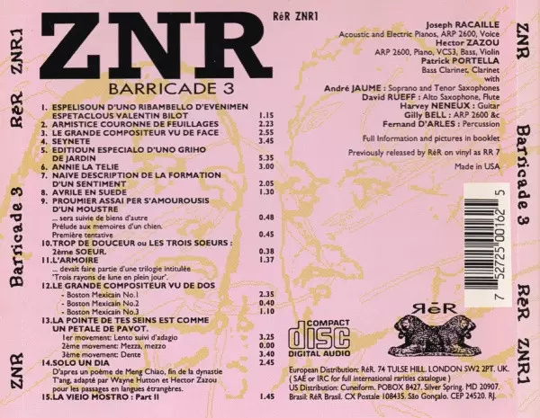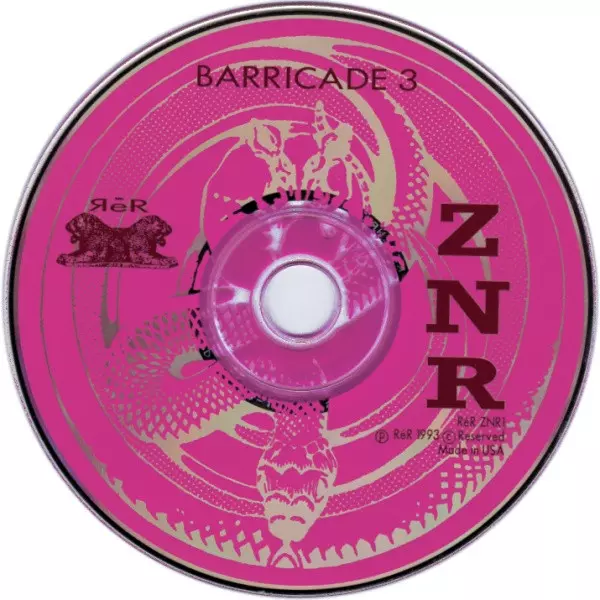 ZNR: Barricade 3 versión en CD en estándar edición. Esta edición en concreto se lanzó en Reino Unido en la editorial ReR Megacorp el día 29. mayo 2001. Álbum abarca todos los géneros Música electrónica, Experimental y Abstract.